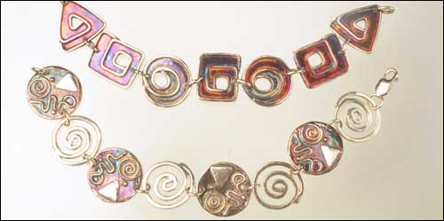 Color Patina Gallery << Previous Page << Home |  B118 (top) - 6.5" geometric link bracelet, $130 B400 (bottom) - 6.75" reversible link bracelet, $130  EA95 (top left) - Patterned square posts with amethyst*, $48 N28 (top right) - Reticulated 18" necklace with amethyst*, $56 N618 (bottom right) - Reticulated 24" necklace with amethyst*, $66 EA49 (bottom left) - Reticulated dangles with amethyst*, $56 * Other stones available: garnet, amethyst, amber, lapis & carnelian. | | |
